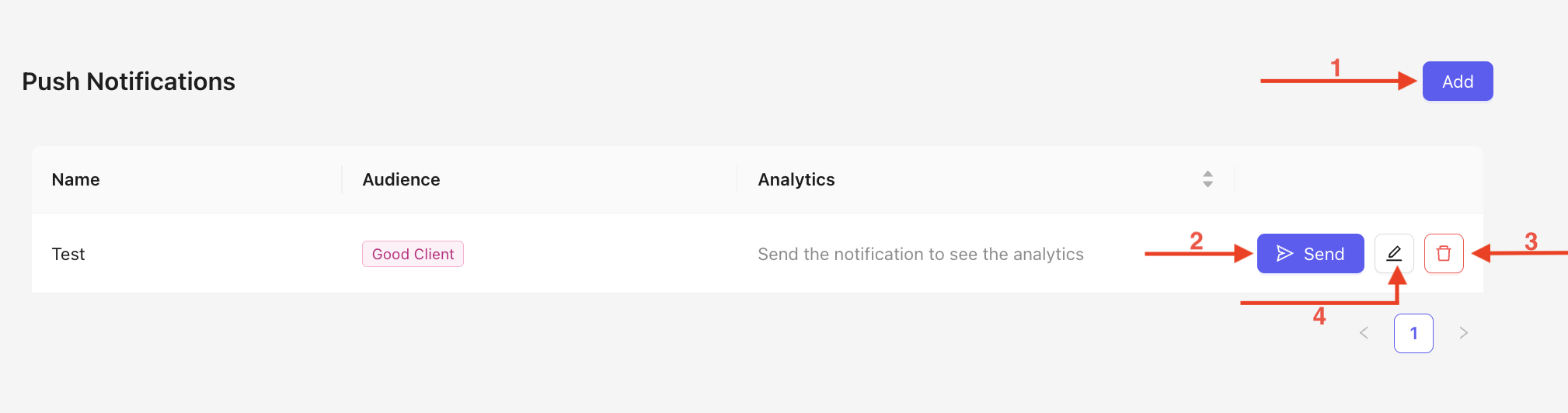 You can delete a Push Notification at any time by clicking on the trash icon.