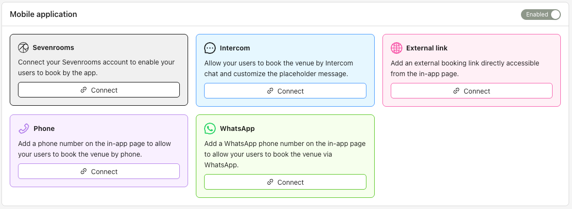 To allow users to book a venue from the mobile app, you must enable booking and connect the venue to a supported booking channel. This guide walks you through the required steps and available connectors.