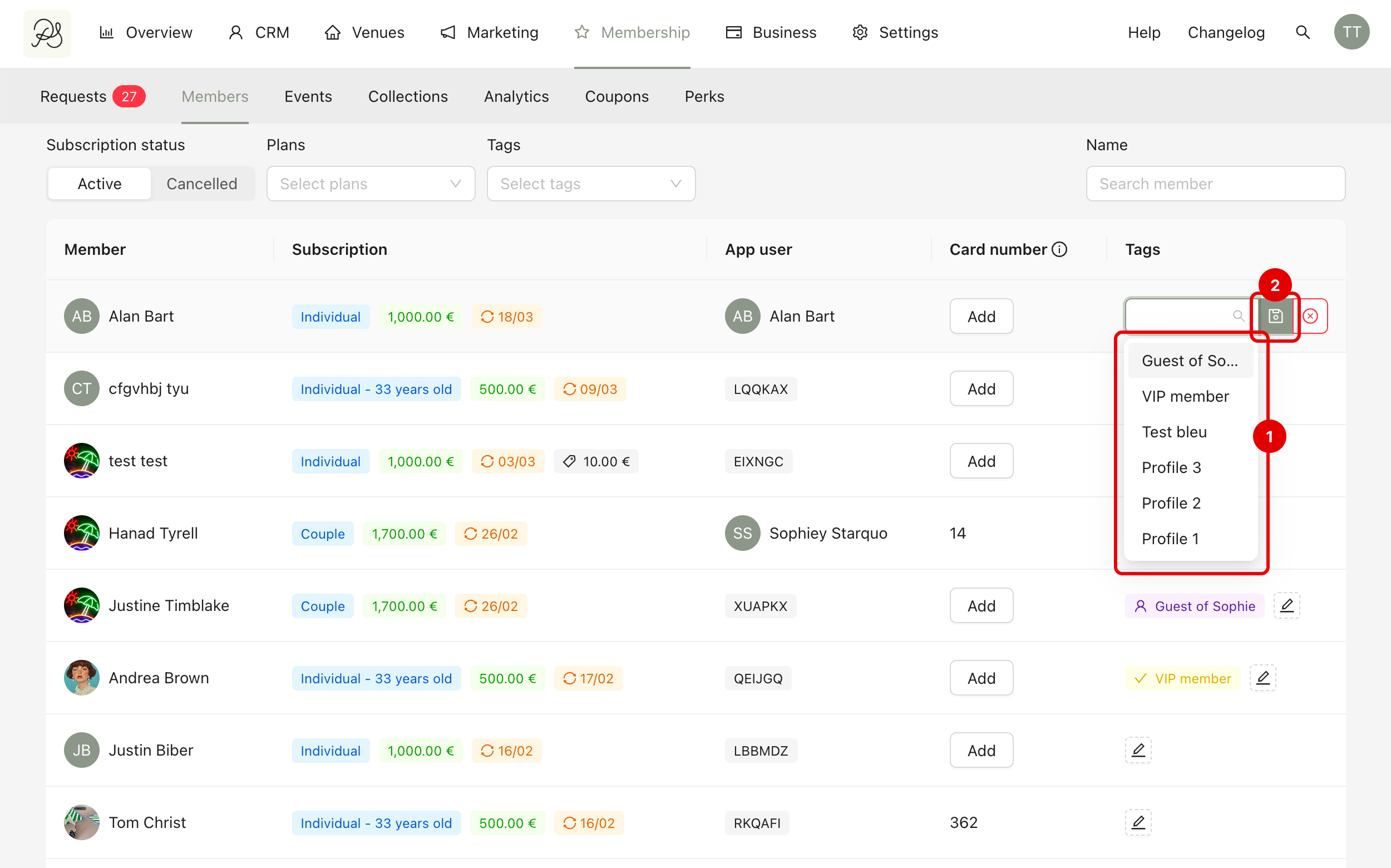 To add tags, find the member in the Members tab and click Edit in the Tags column. Select the desired tag(s) (1) and click Save (2).