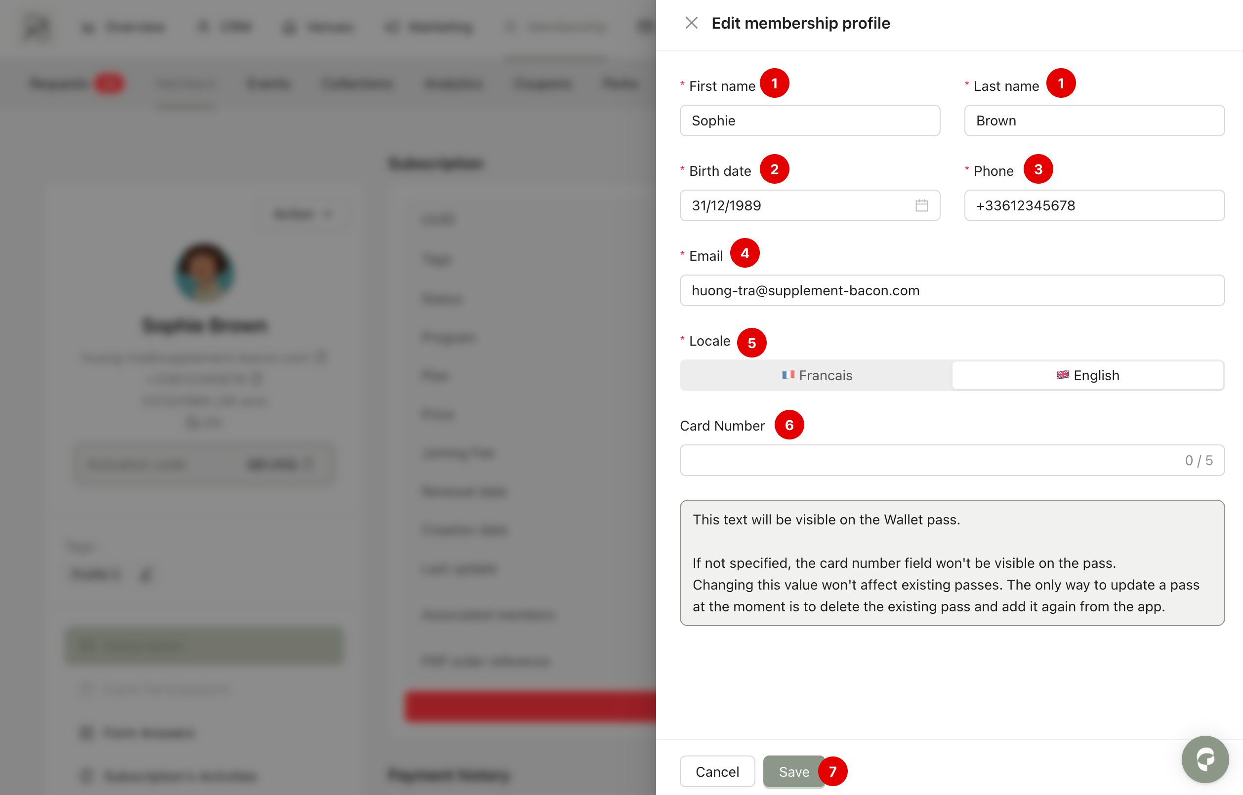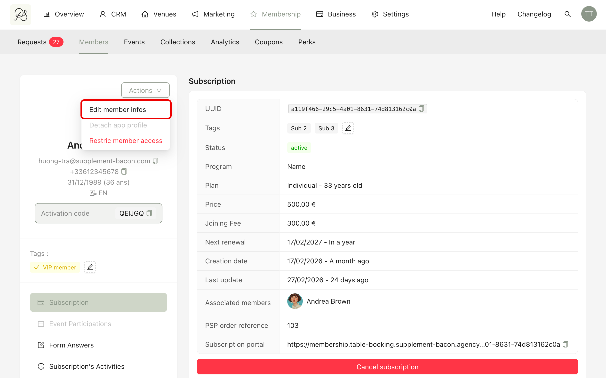 Step 1: Go to Membership → Members and select the member you want to edit to access their detail page. Then click Action → Edit member infos.