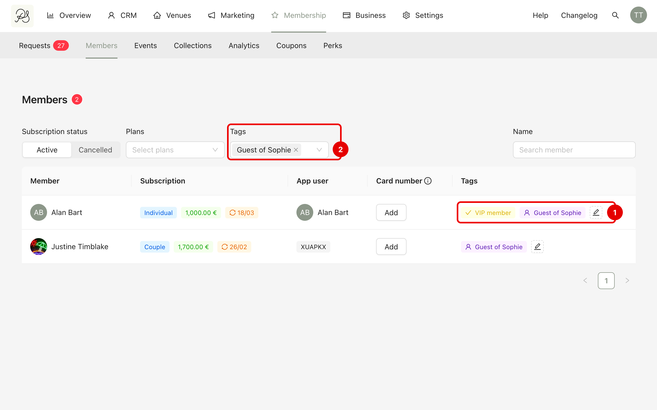 The tags will then appear in the member’s row (1) and can be used for filtering (2).