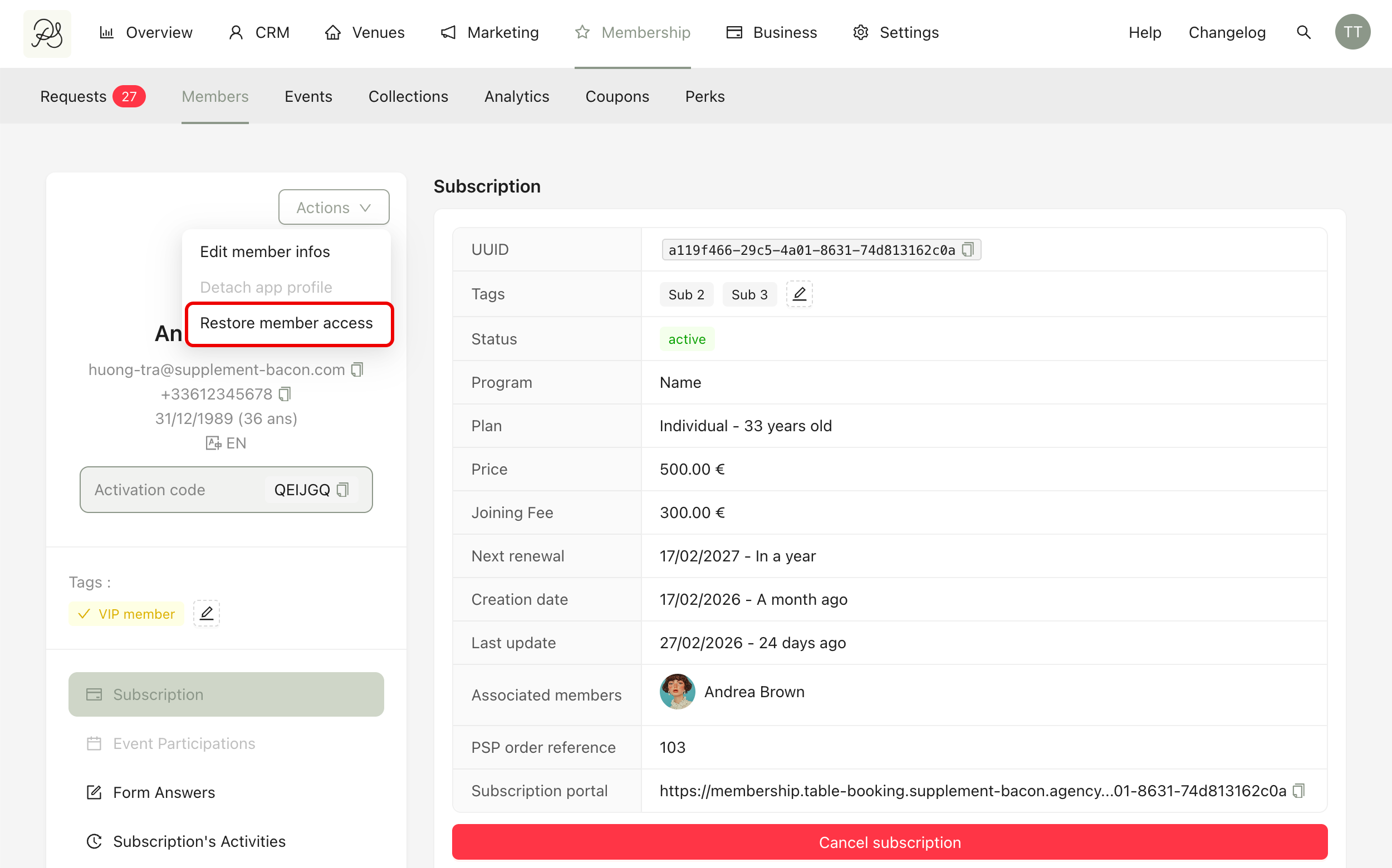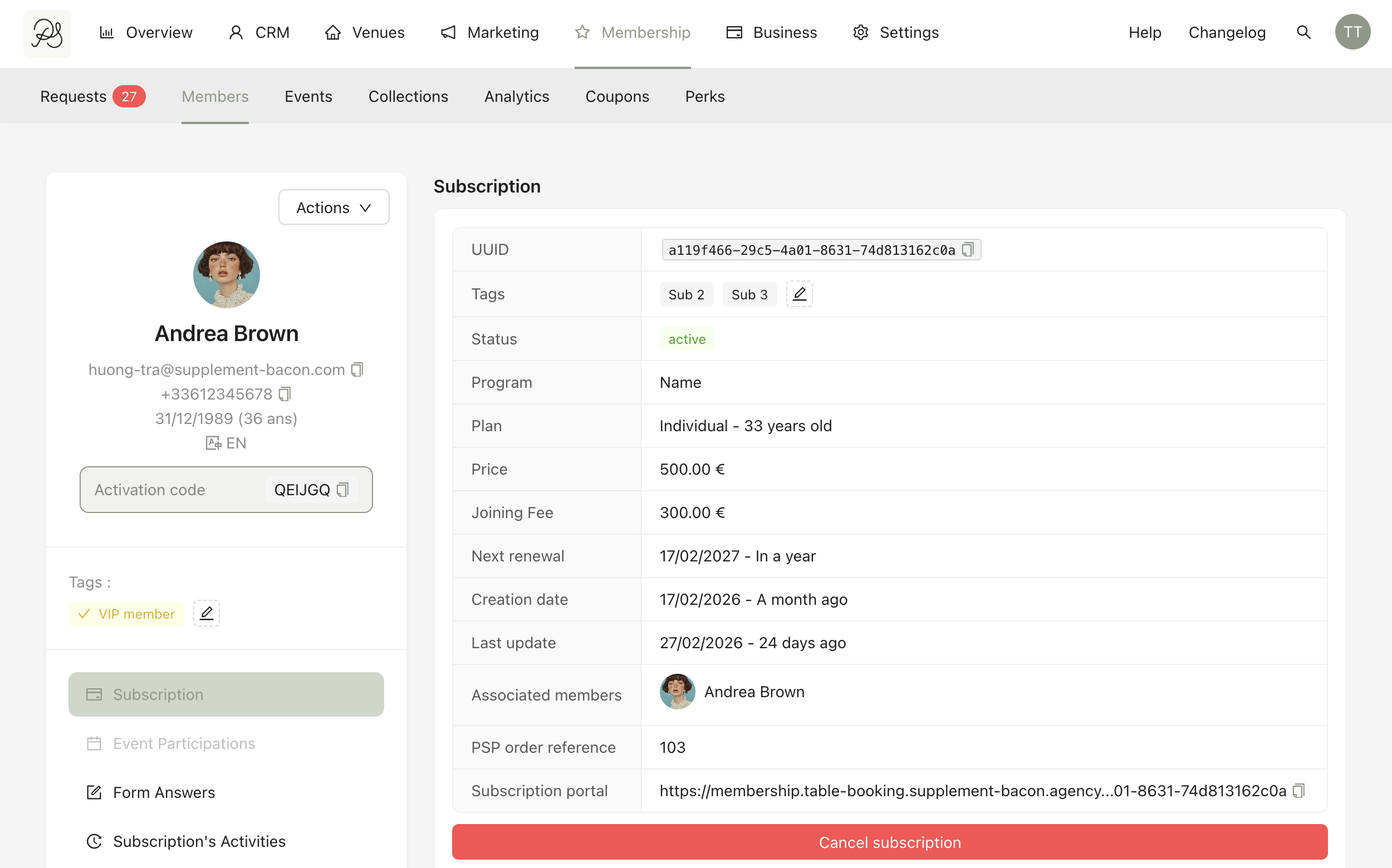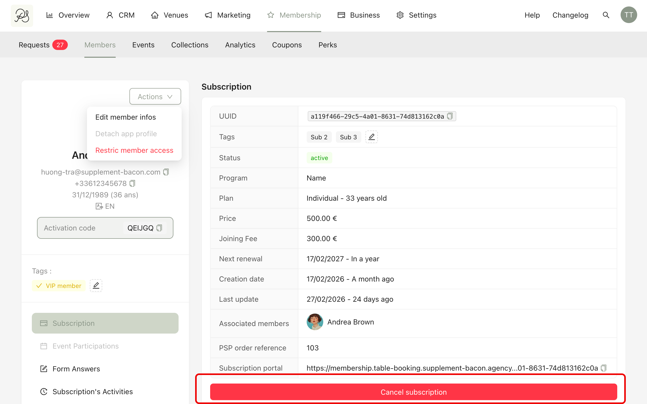 The detail page includes subscription information, form answers, event participation, and activity history. This page gives you a complete overview of the member’s interactions and membership status.