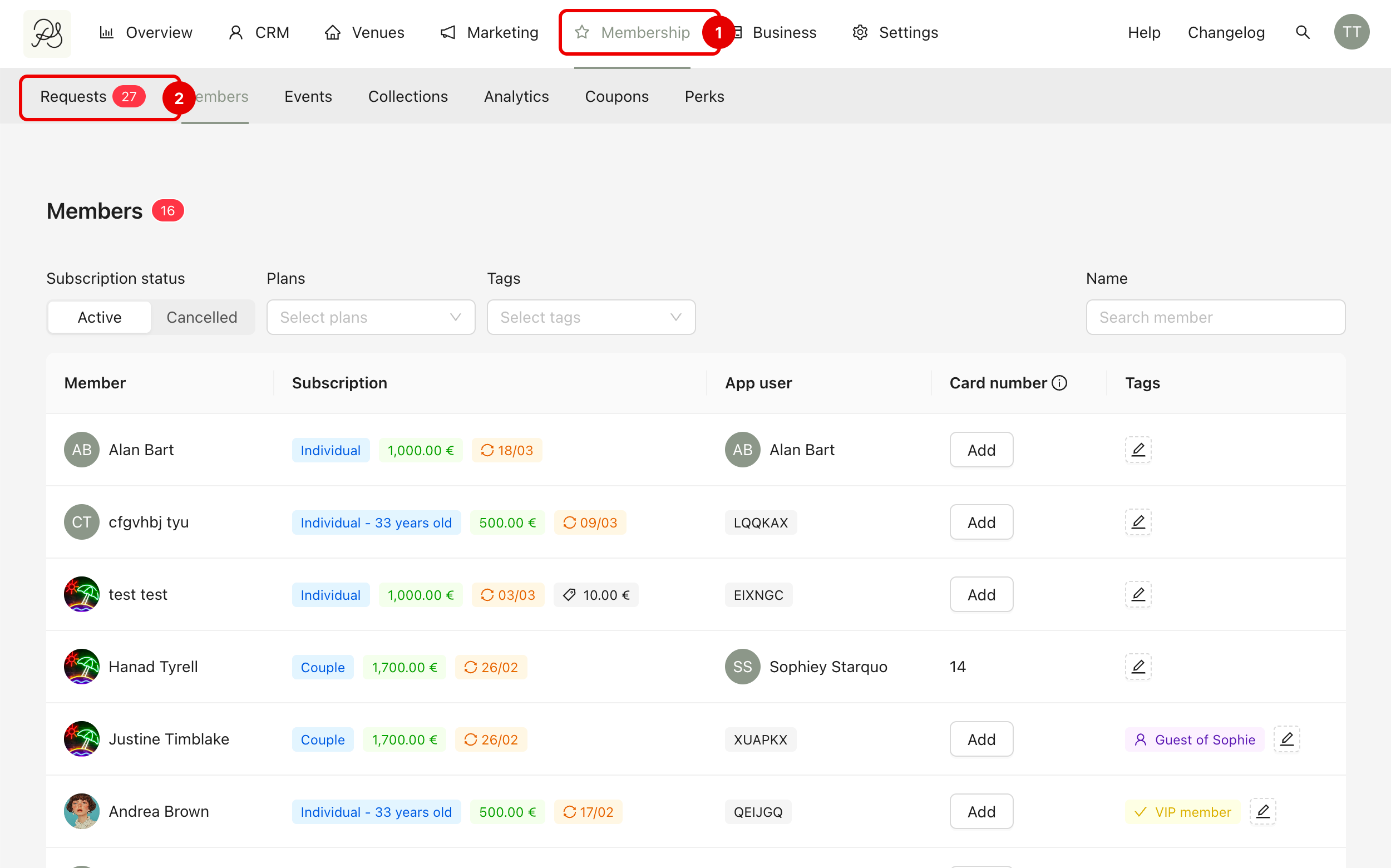 To view members, go to Membership (1) → Members (2). This page displays the full list of members.