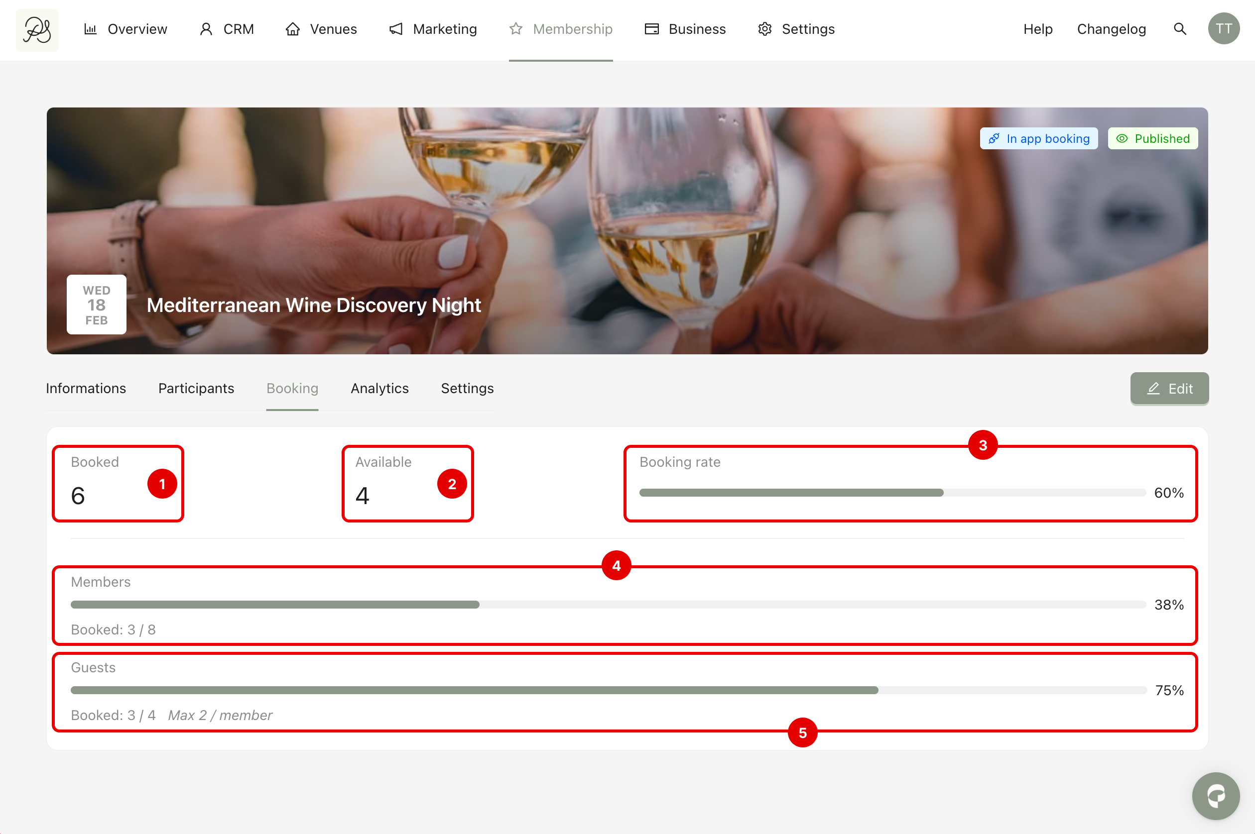 You can analyze performance at three levels: from the calendar overview to monitor multiple events at once, from the Booking tab to check detailed participation numbers for a specific event, and from the Analytics tab to understand member engagement and booking conversion.