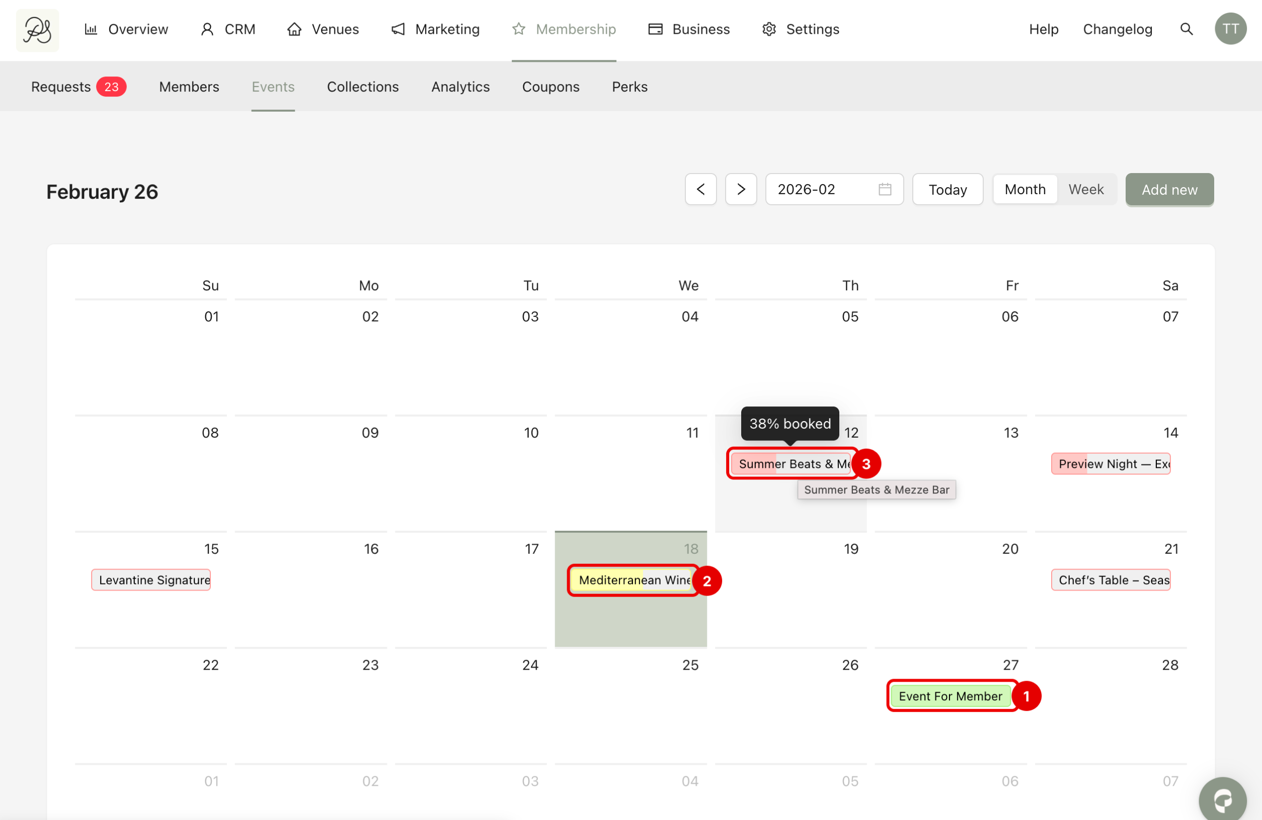 To access the overview, go to Membership → Events. You will see a calendar displaying all your events at their scheduled dates.
